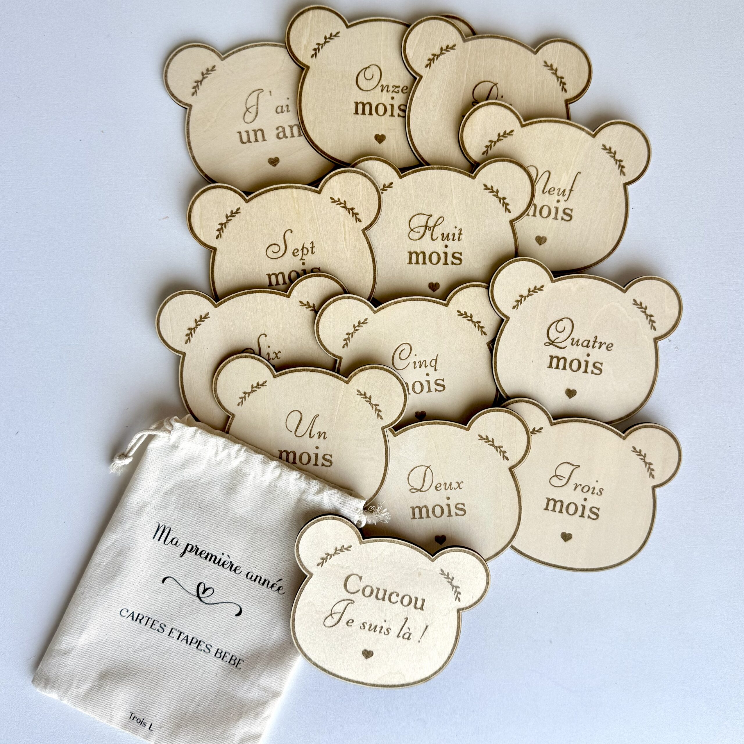 • 13 cartes en bois (de “Je suis là” à “1 an”)