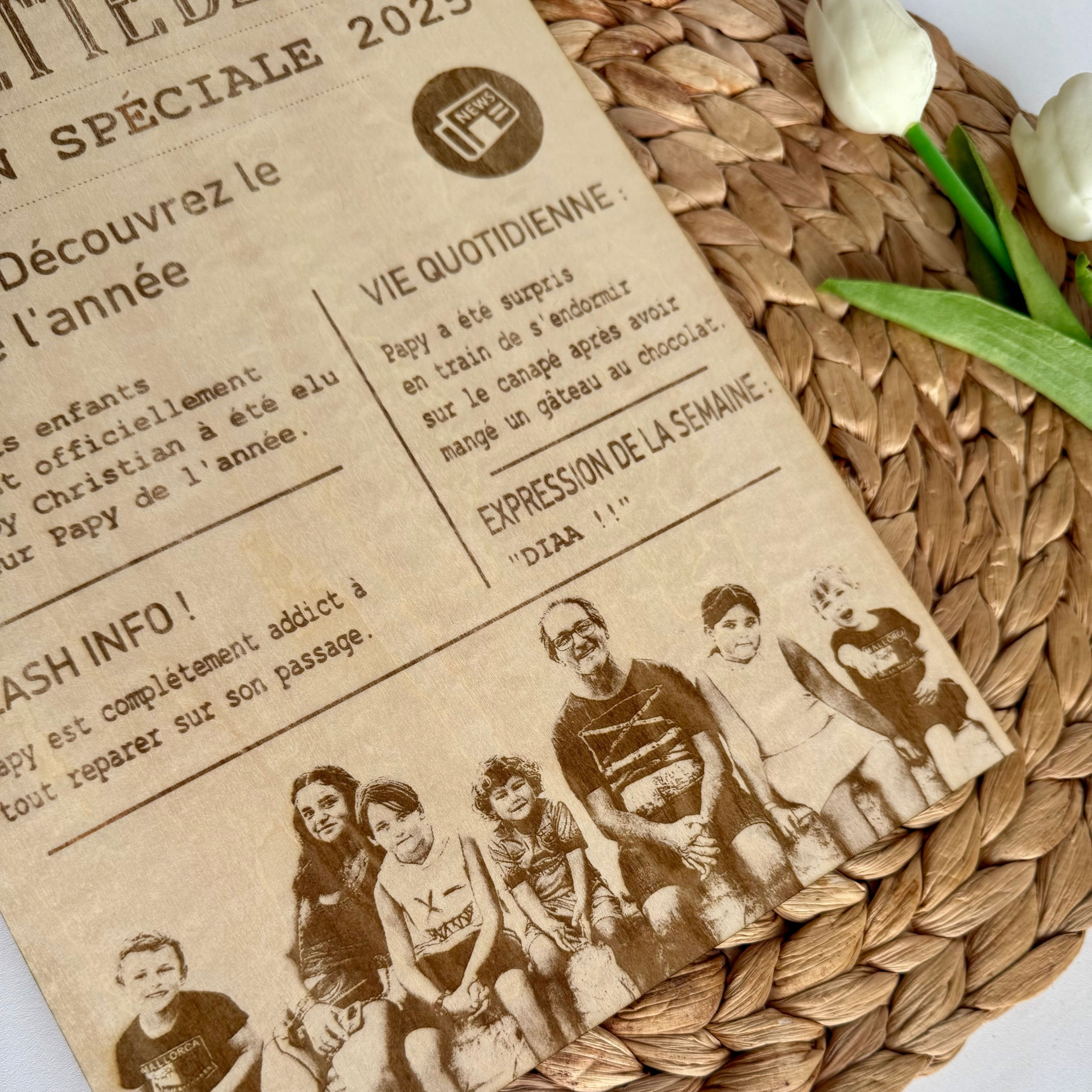 Presentée comme une Une de journal, elle met à l’honneur la personne de votre choix : parent, grand-parent, marraine, tatie, ami… à travers des rubriques amusantes, des petites anecdotes du quotidien et même une photo gravée.
